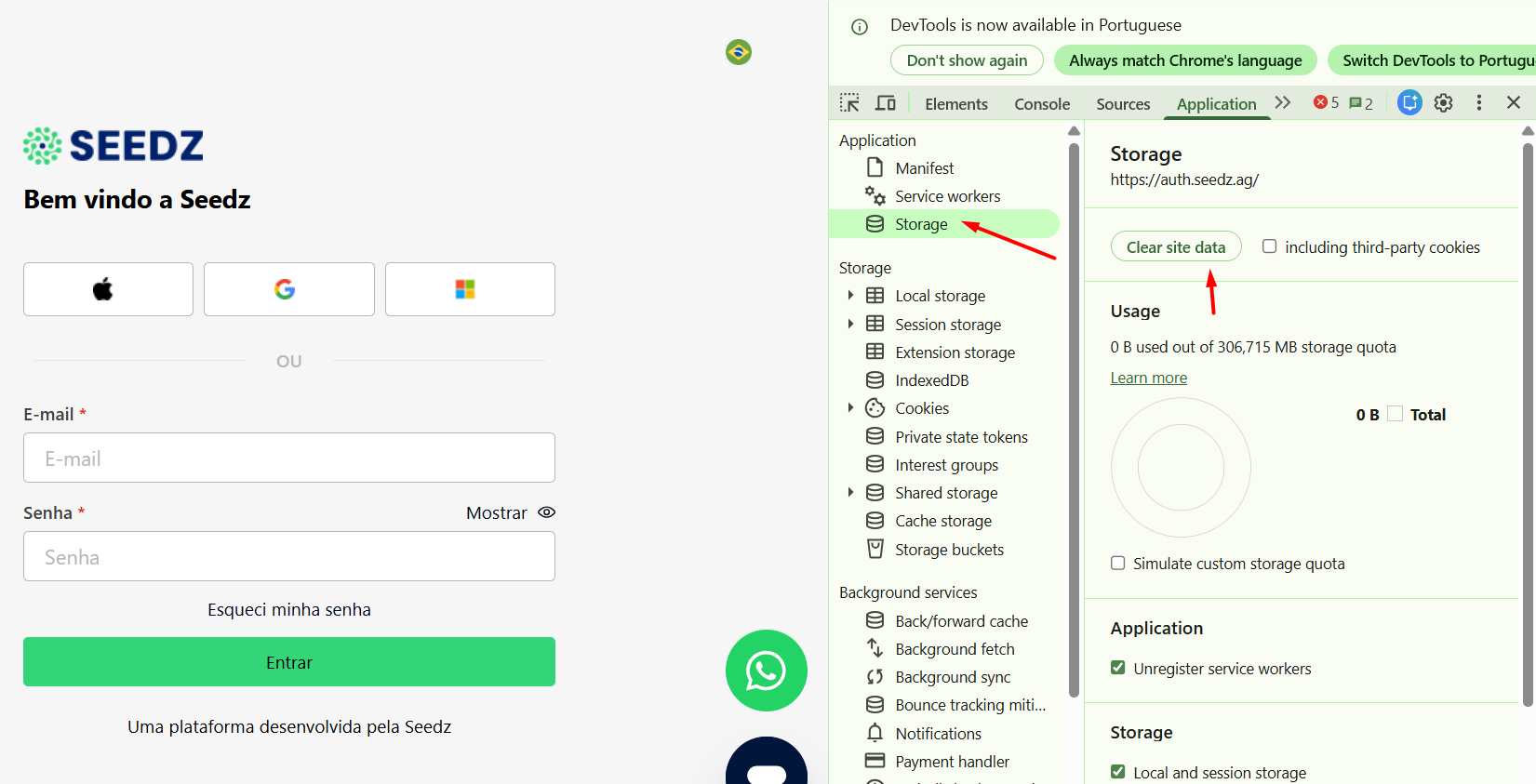 Logo abaixo desse gráfico, procure por um botão grande escrito Clear site data (Limpar dados do site).